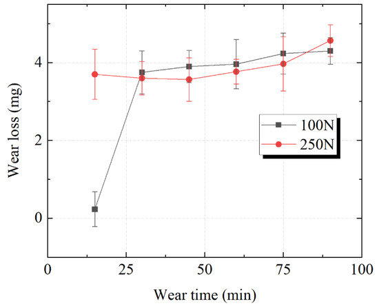 The wear amount of the SS304 seal pairs under different loads is shown in Figure 7. Some studies have shown that an increase in pressure leads to an increase in metal wear [25], and the two curves showed similar trends. The total amount of mass loss was almost the same at the end of the tests. However, there is a clear difference in the variation of the mass loss during the early 30 min of the wear process. The sharp increase of mass loss of SS304 in the early wear stage can be explained by the increase in the number of abrasive particles embedded between the sealing interface, especially on the softer rubber side, thus causing extra damage to the metal seal surface [26,27]. The mass loss of SS304 increased to 3.8 mg in 30 min at a load of 100 N, while the mass loss spiked to 3.8 mg within 15 min at a load of 250 N, and both wear amounts increased slowly and gradually as the wear progressed until a steady state of wear was reached. This implied that the breakage of the particles caused three-body abrasive wear of the sealing pairs, reducing the subsequent mass loss of the SS304 disk. The time-variable curves of the SS304 showed that the high pressure will accelerate the wear amount of SS304 in the early stage and reach the stable wear stage more quickly, but the pressure has little influence on the total wear amount.