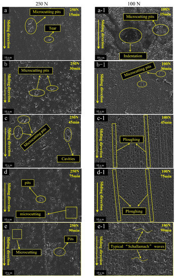 The wear morphologies of the FKM were divided into three stages, which displayed different features at high/low load (Figure 8). At 250 N load, some tear scars and micro-cutting pits were uniformly distributed on the worn FKM surface (Figure 8a). The micro-cutting pits were mainly caused by some particle edges piercing and shearing the rubber surface. In stage II, micro-cutting pits became deeper and many irregular cavities also started to emerge (Figure 8b,c). Finally, many smaller pits were scattered on the smoother surface (Figure 8d,e). These pits were the traces left after the micro-cutting pits were worn off. At 100 N load, a series of micro-cutting pits and some indentations appeared on the rubber surface in stage I. (Figure 8a-1,b-1). As the test progressed, the worn surface gradually showed more ploughing, which is parallel to the sliding direction (Figure 8c-1,d-1). In the final stage, some small typical “Schallamach waves” patterns gradually appeared (Figure 8e-1), which was a typical two-body wear morphology.