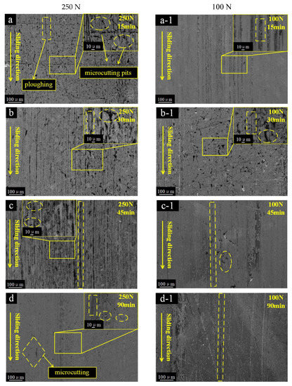 Figure 9 shows a detailed analysis of the typical patterns of SS304 at different stages. The steel presents more significant surface damage under a load of 250 N. These damages show signs of microcutting and microploughing [17]. At about 15 min a slight microploughing started to appear (Figure 9a). Then, the microcutting signs decreased, while microploughing appeared more significantly on the abraded surface (Figure 9b). The microploughing became deeper and longer, which was thought to be caused by trapped particles and sliding movements on the soft rubber surface [27] (Figure 9c). Finally, the surface became smoother by microploughing (Figure 9d).