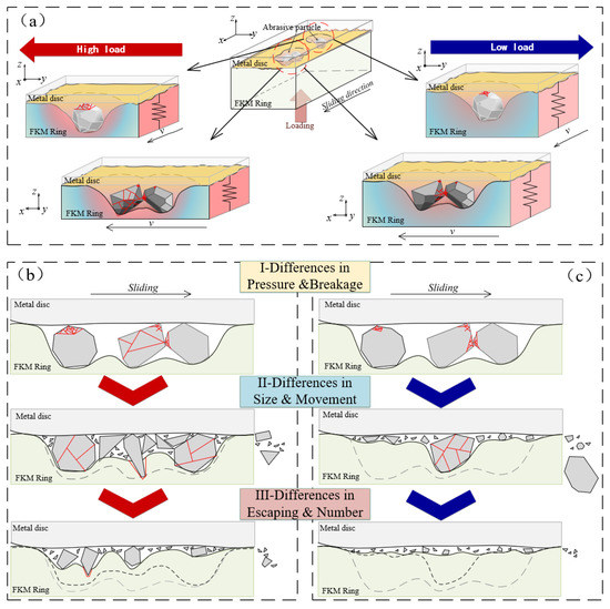 From the wear topography variation of the FKM/SS304 tri-pairs, the breakage processes and fracture types of the particle had a direct effect on the wear damage morphology and wear mechanism of the sealing pairs [2]. Irregularly shaped particles are prone to fracture, which not only reduced the particle size but also decreased the deformation force of rubber. This changed the forces acting on the particle between the soft rubber and hard steel and altered the motion of the particles. Thus, the complex dynamic of friction and wear behavior was directly related to the processes of particles being broken, migrated, and escaped. The wear processes and transformations were compared at low/high loads (Figure 10a).