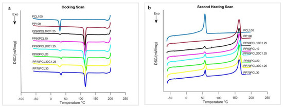 | Tmc (°C) | Tm (°C) | Hmc (Jg−1) | Hm (Jg−1) | Xc (%) | Tmc (°C) | Tm (°C) | Hmc (Jg−1) | Hm (Jg−1) | Xc (%) | |