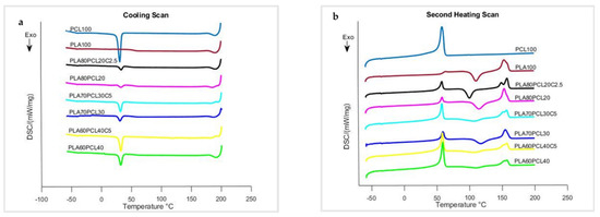 | Tg (°C) | Tm (°C) | Tmc (°C) | Hm (Jg−1) | Hmc (Jg−1) | Xc (%) | Tm (°C) | Tmc (°C) | Hm (Jg−1) | Hmc (Jg−1) | Xc (%) | |