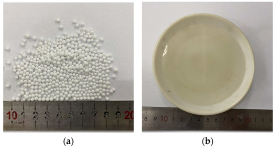 Lime, fly ash, sodium silicate, and soil were used in this test. The soil (Table 1) and fly ash (Table 2) used in the tests were obtained from Shaoxing, Zhejiang Province, China. Lime was quicklime powder produced in Xinyu, Jiangxi Province, China (Table 3). The EPS particles used in the test were obtained from a furniture factory in China. The particle sizes of EPS ranged from 2 to 3 mm, the bulk density was 0.018 g·cm−3, and the pure particle density was 0.0314 g·cm−3, as shown in Figure 1a. The sodium silicate used in the test was obtained from Bengbu Jingcheng Chemical Co., Ltd., Bengbu City, Anhui Province, China, with a concentration of 40% and modulus of 3.2 (Figure 1b).