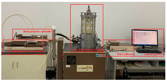 The dynamic triaxial instrument used in this test is produced by GDS Company. The instrument consists of five parts including the confining pressure controller, back pressure controller, cyclic load control host, data collector, and control system, as shown in Figure 2.