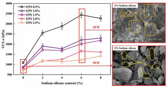 According to the “Technical Guidelines for Construction of Highway Roadbases” JTG/T F20—2015 [37] and reference [38], the proportion of lime and fly ash was 1:3, the mass of lime and fly ash accounted for 20% of the mass of dry soil, the moisture content was 50%, and the masses of EPS particles were 0.5%, 1%, 1.5%, 2%, and 2.5% of the mass of dry soil. In addition, through an unconfined compression test and scanning electron microscope test, different proportions of sodium silicate were added to the EPS granular lightweight soil with lime and fly ash. The results are shown in Figure 3. It was found that the UCS reached a maximum when the sodium silicate content was 6–8%. The SEM test showed that, compared with no sodium silicate, after adding 6% sodium silicate, the internal hydration products (calcium silicate (C-S-H), calcium aluminate (C-A-H)) and gelling products (hydrated calcium aluminosilicate (sodium) (C (N)-A-S-H)) increased significantly, the porosity decreased significantly, and the strength improved [11,35]. Considering the comprehensive economy, the quality of sodium silicate was 6% of the mass of the dry soil. Based on this, dynamic triaxial tests with different confining pressures, amplitudes, and cycle times were conducted. The specific test schemes are listed in Table 4. In this test, displacement was used as the control mode to load it. The loading waveform was sinusoidal, and 50 points were collected for each cycle. This test simulated the traffic cyclic load, and the vibration frequency was 1 Hz [39]. As the axial displacement cyclic loading mode was adopted, the dynamic characteristics changed mainly at the initial stage of cyclic loading; therefore, the maximum number of cycles selected for this study was 100.