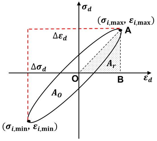 Ed and λ mostly represent the dynamic properties of soil [40,41]. A series of hysteresis loops can be obtained under the action of axial cyclic loads [42]. Figure 5 shows a typical hysteresis loop [43,44], where Ed is the ratio of the maximum stress difference (Equation (1)) to the maximum strain difference (Equation (2)) under the action of a cyclic load [45,46]. The calculation formula is shown in Equation (3).