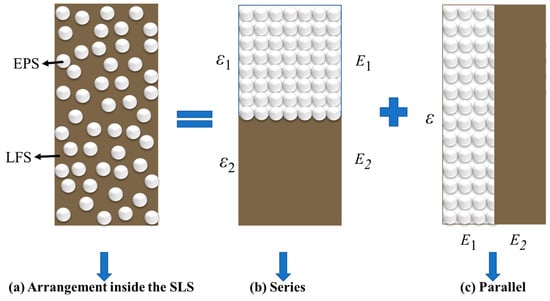 EPS particles and LFS are two kinds of materials with different physical properties. The elastic modulus E1 of EPS particles and E2 of LFS are not equal, and both resist deformation together. In addition, in general physical phenomena series and parallel are common forms of material arrangement. For example, the effective thermal conductivity system of porous material composed of any two phases is determined by the thermal conductivity of the two phases and their distribution. Therefore, when studying the Ed of SLS, the arrangement form of EPS particles and LFS is regarded as a linear combination of series and parallel [54,55]. Assuming that the SLS sample was made up of a series of springs, the sample could contain series and parallel forms of LFS and EPS particles, as shown in Figure 7.