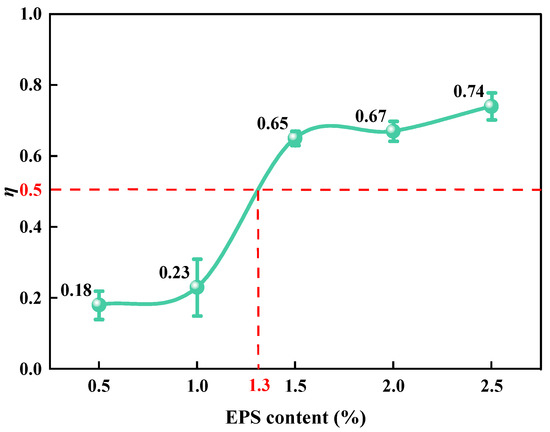 The value of η was obtained using Equation (7). Under different EC conditions, the proportions of SLS samples in series and parallel were obtained. The relationship between η and EC is illustrated in Figure 8. It can be observed that when EC was less than 1%, the value of η was less than 0.23, and the change was slight. The EPS and LFS in the sample mostly existed in parallel. When the EC increased from 1% to 1.5%, the η value increased rapidly from 0.23 to 0.65, and the LFS and EPS particles in the sample changed mainly from being in parallel to being in series. When the EC value was greater than 1.5%, the η value increased gradually to 0.74 with an increase in EPS content. The LFS and EPS particles mainly existed in series mode in the sample. The series and parallel models reasonably explained how the Ed in Figure 6 decreased in three stages of the “Z” shape with an increase in EC.