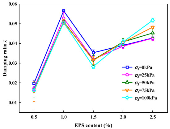 - When EC > 1.5%, λ increased with increasing EPS particle content. This was caused by the increase in the EPS particle content, which replaced the LFS. As the pore structure in the SLS increased, the LFS volume decreased, and more energy was lost in the propagation of stress waves in the SLS, which contained a large proportion of EPS particles. As the cyclic loading continued, there were still many EPS particles that were not compacted. This portion of the EPS particles produced elastic deformation and consumed energy; thus, λ increased again.