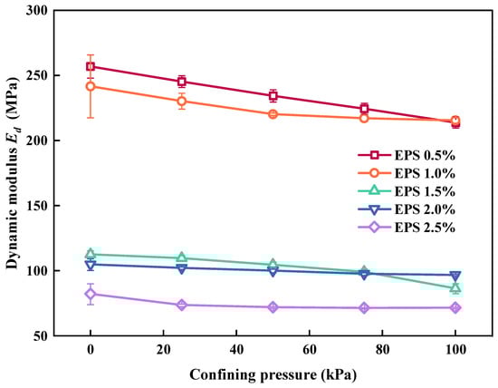 - When EC was constant, the Ed of the SLS decreased with an increase in σ3 and amplitude; however, the effect of change in confining pressure and amplitude on Ed was not obvious under high EC values. This was because the number of EPS particles was too high and some EPS particles in the SLS provided elastic properties; thus, the reduction in Ed was not obvious. The λ of the SLS generally decreased with an increase in the confining pressure and amplitude, and the variation range was small (within 0.5%).