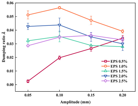 Figure 13 shows the effect of amplitude on λ. As can be observed, the λ of the SLS decreased as the amplitude increased, and the variation range was very limited. This was caused by the increase in the amplitude. During cyclic loading, the interior of the SLS was gradually compacted, and the slip and dislocation of particles in the SLS were reduced, reducing the energy consumed by friction. When EC was 0.5%, the λ value of the SLS increased rapidly with an increase in amplitude. This was because when EC was small there was more LFS in the same volume of the SLS. With an increase in amplitude, under the action of a cyclic load, the overall skeleton loosens. Because of the increase in energy dissipated by friction, more energy was lost during the transmission process of the stress wave, resulting in an increase in λ.