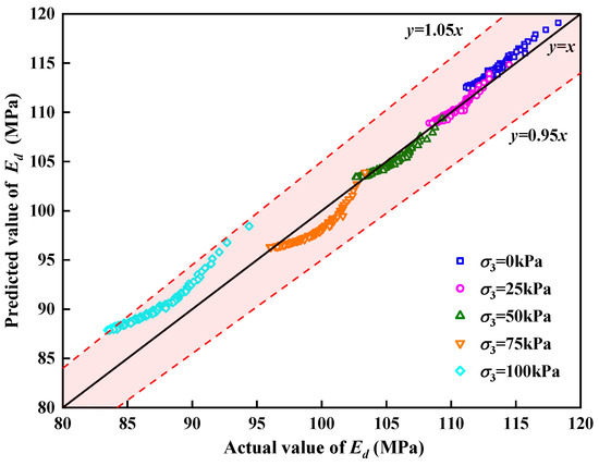 The predicted value of the dynamic elastic modulus calculated using Equation (11) was compared with the actual value of the dynamic elastic modulus obtained from the tests. The comparison results are shown in Figure 16. It can be observed that the predicted value of Ed was consistent with the experimental value, with an error within 5%. The model predicted the varying trend of the Ed of the SLS with different confining pressures and cycle times.