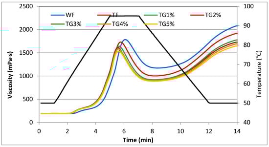 Differences in the rheological properties of flours and mixtures of triticale flour and vital gluten were assessed using the RVA method. The pasting curves of all analyzed samples are shown in Figure 1, while the determined values of pasting characteristics parameters are listed in Table 3. Protein molecules can affect the gelatinization process in different ways, depending on their ability to retain water and their ability to interact with starch molecules []. A statistically significant effect of partial replacement of triticale flour with vital wheat gluten on the gelatinization curves and parameters of this process was found. Nevertheless, the highest peak and highest maximum viscosity were characterized by the WF slurry. The TF slurry was characterized by a lower peak compared to WF, and the higher the vital gluten additive, the lower the peak observed on the graph, and thus the lower the maximum viscosity of the slurry. It was also observed that the flour-gluten systems reached their maximum viscosity in a shorter time compared to WF and TF (Figure 1).