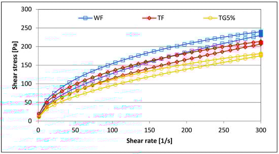 In the tested systems, the areas of the hysteresis loop between the up and down flow curves were marked (Figure 3), which is the area used to quantify the thixotropic behavior of the sample (Figure 4). It was found that the highest value of the area of the hysteresis loop was characterized by WF, with TF slightly lower. On the other hand, TG mixtures with different shares of vital gluten were characterized by significantly lower values of the area of the hysteresis loop (Figure 4). Thus, this indicates that the TG systems took less time to rebuild the structure after the shear stress was released. The opposite trend was found by Gałkowska et al. [], who observed an increase in the surface area of the hysteresis loop in CS (with different amylose content)/PP systems. Moreover, the value of this parameter increased as the share of PP increased. Thixotropy is any process in which, as a result of the destruction of the internal structure of the system, there is an isothermal reduction of the internal friction of the liquid with the elapse of shear time, but also a slow return to its original consistency during rest, measurable in time []. Under the influence of the shearing force, the internal structure of the sample is destroyed. The measurement is visualized in the form of flow curves, i.e., the relationship between shear stress and shear rate. Comparing the course of the flow curve, plotted at an increasing shear rate, with the flow curve at a decreasing shear rate, it is possible to determine the extent of destruction of the thixotropic structure. An example of the flow curves of the tested systems is shown in Figure 3.