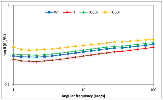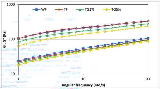 In pastes based on WF, TF and TG mixtures, viscoelastic properties were determined using an oscillating rheometer. The storage modulus (G′) and loss modulus (G″) profiles for all examined samples as a function of angular frequency (1–100 rad/s) are shown in Figure 5.