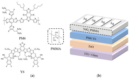 The PM6 donor and Y6 acceptor were purchased from Solarmer Materials, Inc., Beijing, China. The PMMA (Mw~350,000) was purchased from Sigma-Aldrich (Shanghai) Trading Co., Ltd., Shanghai, China. All other chemical reagents were ordered from TCI (Shanghai) Development Co., Ltd., Shanghai, China. The molecular structures of PM6, Y6, and PMMA are displayed in Figure 1a, and the device structure of the OSC is depicted in Figure 1b.