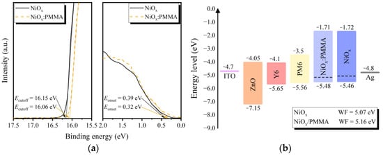 To study the effect of PMMA doping on energy levels, UPS measurements of pristine and doped NiOx HTLs were conducted. The binding energies of the cutoff region (Ecutoff) and the onset region (Eonset) can be extracted from the UPS spectra in Figure 5a. The band gap energy (Eg) was estimated by the Tauc plot method from the transmittance spectra in Figure S1. The Eg values for undoped NiOx and PMMA-doped NiOx were 3.74 eV and 3.77 eV, respectively. With the excitation energy value (hν) of 21.22 eV (He I), the WF was calculated by subtracting the Ecutoff from the hν. The pristine NiOx HTL had a WF of 5.07 eV. For the NiOx:PMMA HTL, the WF value increased to 5.16 eV. Combining the results of Eg, WF, and Eonset, the valence band maximum (VBM) and conduction band minimum (CBM) can be calculated. For the pristine and modified HTLs, the VBM levels were 1.72 eV and 1.71 eV, and the corresponding CBM levels were 5.46 eV and 5.48 eV, respectively. Given the above results, the energy level diagram of the OSCs is plotted in Figure 5b. Rather than the recombinational hole transport of other metal oxides (e.g., MoOx) that occurs at the interface between the active layer and HTL, NiOx exhibits intrinsic p-type hole transport, whereby the photogenerated holes from the donor are directly transported to the anode through the valence band of the HTL []. Therefore, the energy level matching between the WF of the NiOx HTL and the HOMO of the donor is an important factor for achieving desirable device performance []. The deeper WF and the shifted energy level alignments of the PMMA-doped NiOx HTL help to optimize the hole extraction and collection efficiencies, thus contributing to the improved JSC and FF for the modified OSC device.