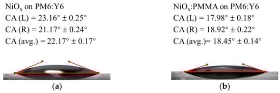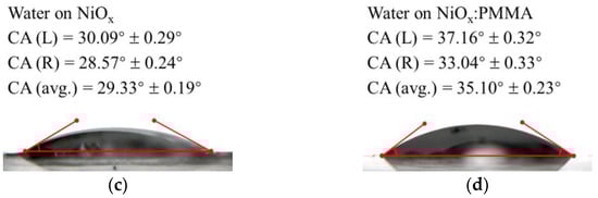 Contact angle (CA) measurements were carried out to collect additional evidence of improvements brought about by doping the PMMA. The CA images of undoped or PMMA-doped NiOx NP dispersions on the PM6:Y6 BHJ film are provided in Figure 7a,b. Owing to the incorporation of the polymer, the modified NiOx NP dispersions have a reduced CA from 22.17° ± 0.17° to 18.45° ± 0.14°, indicating its improved wettability on the BHJ. This could benefit the deposition quality of the HTL film, further boosting the device performance of OSCs []. The CA images of distilled water on the NiOx and NiOx:PMMA HTL films are displayed in Figure 7c,d. Since the CA of water on the NiOx:PMMA film increased from 29.33° ± 0.19° to 35.10° ± 0.23° over the pristine film, the enhanced hydrophobicity of the HTL could provide better protection for the active layer from water in ambient conditions.