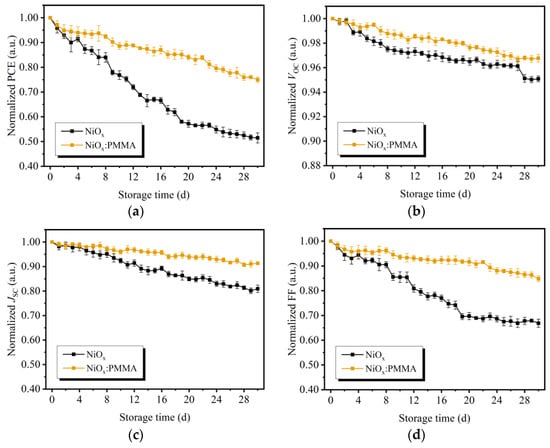 To reveal the morphological evolutions of the NiOx NP HTL after the modification of PMMA, the surface morphologies of the different HTLs were characterized by atomic force microscopy (AFM) and scanning electron microscopy (SEM). The AFM height images of the bare NiOx HTL and the PMMA-doped NiOx HTL are shown in Figure 6a,b. The bare NiOx HTL has a relatively coarse surface, accompanied by a root mean square (RMS) roughness value of 2.793 nm. By contrast, the PMMA-doped HTL has a smoother surface with a significantly decreased RMS value of 1.603 nm. From the top-view SEM images in Figure 6c,d, visible pinholes can be found for the unmodified NiOx HTL. After the doping of PMMA, the long-chain polymer with high molecular weight could fill the gaps between the NiOx NPs, resulting in an HTL film of more continuously organized NPs with fewer pinholes [,]. The AFM and SEM results suggest improved surface smoothness and uniformity of the NiOx:PMMA HTL film, which could be beneficial for promoting charge transportation and restricting charge recombination. The pinhole-less and denser morphology of the PMMA-doped HTL could also help to improve device stability by resisting the penetration of water, oxygen, and the top metal electrode [].