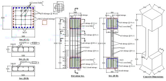 A prototype column was chosen in the ground story of an existing office building with seven stories. The column was then half-scaled to be used as a control test specimen. As seen in Table 1, the test matrix comprises six columns with sections having a depth/width ratio of 4. It included two un-retrofitted columns [] that were utilized as control specimens (C1 and C2). The other four columns (S1, S2, S3, and S4) were retrofitted with schemes 1, 2, 3, and 4, respectively. Figure 1 presents the details of control specimens (C1 and C2). Dimensions of the columns were 125 mm (width) × 500 mm (depth) × 1200 mm (height), and the vertical steel reinforcement was 10 Φ 10 mm. In the central 600 mm part of the height, transverse ties of Φ8 mm at a spacing of 200 mm were provided; in the end parts, transverse ties of Φ10 mm at a spacing of 50 mm were used. As illustrated in Figure 1, the ends of the specimen have RC boxes of dimensions 500 × 500 × 500 mm to minimize the stress concentration. The end boxes were heavily reinforced to remain uncracked throughout the test.