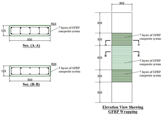 RC wall-like columns have been frequently used in the multistory RC buildings of Saudi Arabia to save the space occupied by columns. These columns often need strengthening due to several reasons, such as the addition of more stories and increasing the live load as a result of changing the usage of the building. The traditional schemes for upgrading RC columns were the installation of RC jackets [,] and steel jackets [,,,,] around the original column. However, these traditional techniques are time-consuming and difficult in their installation. Therefore, fiber-reinforced polymer (FRP) composites have been used recently in upgrading RC wall-like columns owing to their advantages, such as quick and easy installation, and almost negligible change in the column dimensions.