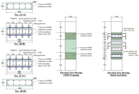 In specimen S2, the second scheme of strengthening (scheme 2) used the externally bonded GFRP composite system of S1 combined with bolted steel plates. For each of the larger dimensions of the section, four steel plates of 460 × 120 mm size and 10 mm thickness were added at a vertical spacing of 300 mm (measured on centers). The steel plates provided on the two opposite faces were bolted together using high-strength steel rods (diameter = 18 mm). The steel plates were used for enhancing the confinement added by the GFRP wrapping. Figure 3 shows the details of this strengthening scheme.