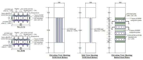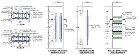 For high-strength rods and different diameters of steel bars, standard coupons were tested under uniaxial tension as per [], and Table 2 presents the average mechanical properties. For GFRP composite sheets, standard coupons were tested under uniaxial tension as per [], and Table 2 shows the average mechanical properties. As per [], the longitudinal tensile strength seen in Table 2 for GFRP sheets was calculated as 0.55 times the average tensile strength of the flat coupons. For steel plates, standard coupons were tested as per [], and the average mechanical properties are given in Table 2. For the epoxy-based mortar used with NSM bars, the mechanical properties given in Table 2 are provided by the datasheet of the manufacturer.