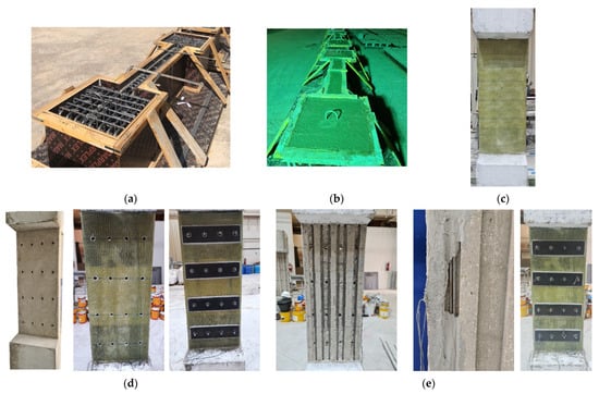 Preparation of columns: (a) reinforcement cage in the formwork before concrete casting; (b) column specimens after concrete casting; (c) strengthened specimen S1 after GFRP wrapping; (d) strengthening of specimen S2 using GFRP sheets combined with bolted steel plates; (e) strengthening of specimen S3 using GFRP sheets combined with bolted steel plates and connected NSM bars.