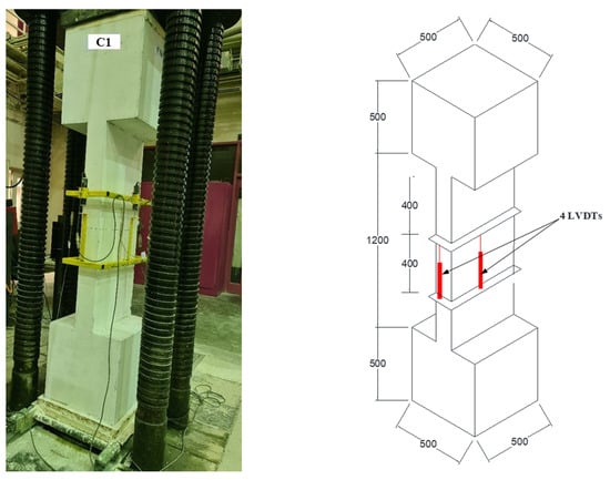 The layout of sensors and test setup for column specimens are presented in Figure 7. A compression machine (capacity = 10,000 kN) was employed for applying concentric axial compression on the columns. As seen in Figure 7, four LVDTs were connected to the middle portion for measuring the axial displacement. Electric resistance strain gages were also attached to the concrete surface, steel bars, steel plates, and GFRP sheets to record their strains during the test. The experimental results were recorded with the help of a data acquisition system.