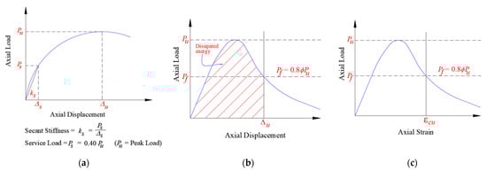 Definition of response parameters for column specimens [,,]: (a) secant stiffness; (b) dissipated energy; (c) ultimate concrete strain.