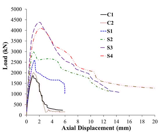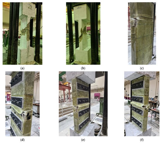 The experimental load–displacement plots for the six tested columns are displayed in Figure 9. The observed failure modes of tested columns are presented in Figure 10. In the next subsections, the experimental results of the control and strengthened columns are discussed.
