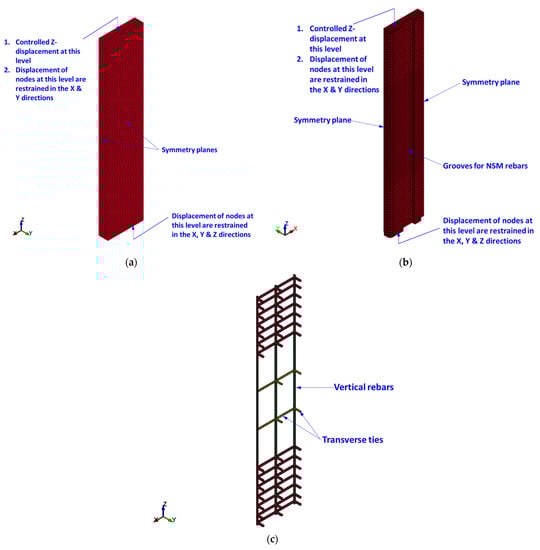 Alsayed et al. [] examined FRP-upgraded RC wall-like columns loaded under axial compression with zero eccentricity. The rectangular section was changed to an elliptical one via cementitious mortar, and it was thereafter wrapped by CFRP sheets. Nonlinear 3D FE analysis was also conducted for evaluating the load versus displacement response of tested specimens. CFRP wrapping increased both the ductility and strength of columns. Abbas et al. [] further extended this study by considering some more schemes for the strengthening of wall-like columns. Triantafillou et al. [] investigated the experimental response of FRP-upgraded wall-like columns. Forty-five columns with a section having depth-to-width ratios of 3 and 4 were tested under concentric compression. Different strengthening techniques were studied. They included unanchored and anchored CFRP confinement with or without section modification. The study concluded that the CFRP confinement effectiveness was almost doubled by the properly distributed anchors.