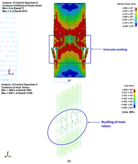 As presented in Table 3 and Figure 9, the ultimate loads of the two control columns, C1 and C2, were 1862 and 2006 kN, respectively []. The axial resistance of the control columns continued to decrease after reaching the peak load until it dropped down to very small values. Figure 10a,b displays the failure modes for columns C1 and C2, respectively. Both columns had a common brittle failure that started with spalling of the concrete cover at high axial strains. This was succeeded by buckling of vertical bars and then crushing of concrete in the middle part of the column, as seen in Figure 10a,b.