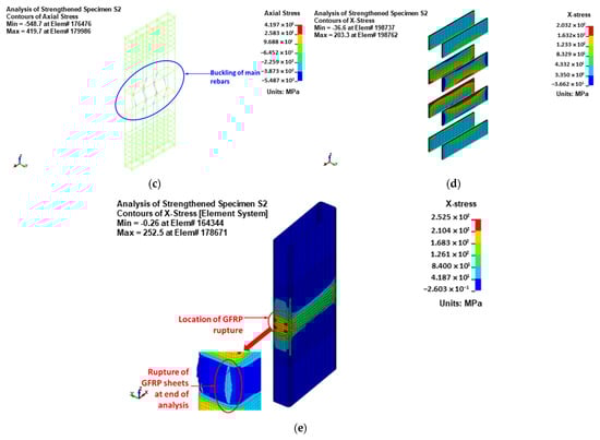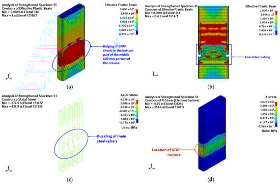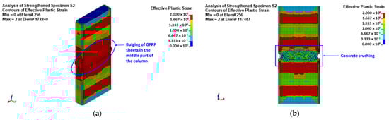 This column was retrofitted with scheme 1 (GFRP wrapping). As presented in Table 3 and Figure 9, the ultimate load of the column was 2596 kN, which is 34% more than the average maximum load of the control columns C1 and C2. It is also depicted that GFRP wrapping significantly enhanced the ultimate displacement, as it was about 76% higher than the average value of the control columns. Figure 10c shows the observed failure mode of strengthened column S1. The column failure originated from the bulging of its section, which caused an outward push on the GFRP sheets in the central 600 mm length, where the tie spacing was 200 mm. Upon reaching the ultimate load, there was a sudden small drop in the axial capacity. The increase in the bulging of the column section and the consequent buckling of the vertical bars, especially those on the short side of the column, resulted in the rupture of GFRP sheets on the smaller side of the section and caused column failure at a very high axial strain (see Figure 10c).