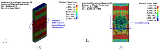 - The FE results with regard to failure modes and load–displacement behavior accurately matched the test results. This validates the employed models of constitutive materials (concrete, GFRP sheets, and steel). Thus, the conducted FE analysis can be utilized in forthcoming studies on the strengthening of RC columns.