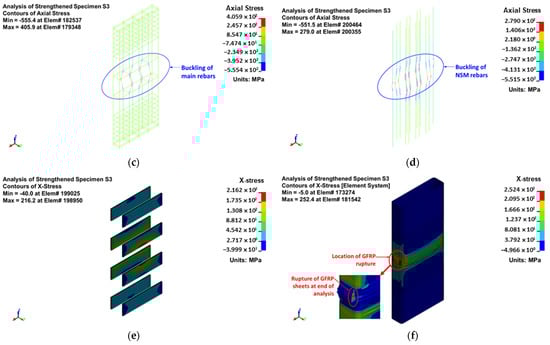 This specimen was upgraded by the fourth scheme, which is identical to the third scheme, but the NSM bars were detached from the end bulbs. The ultimate load improvement for specimen S4 is 112% compared with the control columns C1 and C2. The ultimate load of column S4 was 4105 kN, which is more than that of specimens S1 and S2 by 58% and 38%, respectively. Nevertheless, it is less than the maximum load of column S3 by about 6%. As seen from Table 3 and Figure 9, the ultimate displacement of column S4 was considerably more than that control columns and strengthened specimen S1 by about 202% and 71%, respectively. However, it was less than that of specimen S2 by about 15% due to the buckling of NSM bars. Compared with specimen S3, the ultimate displacement of specimen S4 was higher by about 17%. Figure 10f shows the observed failure mode of specimen S4. The failure is almost identical to column S3, and it originated from the bulging of the GFRP sheets between the steel plates at the central part of the column height, which caused a drop in the load. The final failure was by the rupture of GFRP wrapping near the column corner owing to the buckling of both the original and NSM bars on the smaller side of the column, as seen in Figure 10f. As distinguished from the observations of the experiments, the detached NSM bars in column S4 entirely contributed to resisting the load until their buckling. Thus, the difference in peak load and ultimate displacement between specimens S3 and S4 could be attributed to the variation in material properties.