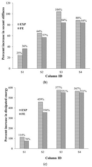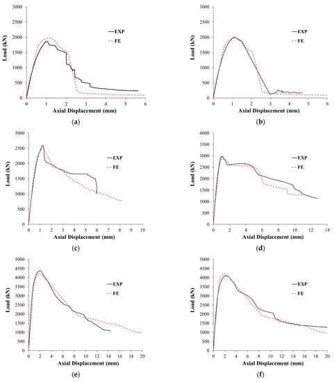 Equations (4)–(6) were utilized to assess the confined concrete strength (), and the peak load of upgraded column S2 was computed from Equation (3) after replacing with .