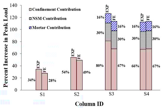 It is clarified from Figure 21 that the addition of bolted steel plates in column S2 enhanced the section confinement with the peak load enhancements (compared with control columns) increased from 34% (for specimen S1) to 54% and 28% (for specimen S1) to 49% for test and numerical results, respectively. The addition of NSM bars in specimens S3 and S4 added more confinement to the column section by increasing the experimental peak load enhancement from 54% (for specimen S2) to 80% and 66%, respectively. For both specimens S3 and S4, it was also predicted that the addition of NSM bars provided more section confinement and the confinement contribution increased from 49% (for specimen S2) to 67%. As clarified earlier from Figure 20a, schemes 3 and 4 had experimental peak load enhancements of 126% and 112%, respectively. As presented in Figure 21, these enhancement ratios are divided into 80% and 66%, respectively, provided by section confinement, 30% contributed by the axial resistance of NSM bars, and the remaining 16% provided by the increased strength of mortar. However, for both schemes 3 and 4 a maximum load increase of 113% was predicted, which is divided into 67% added by section confinement, 30% provided by NSM bars, and 16% added by the enhanced mortar strength.