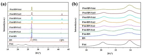 In addition, it should be noted that in some of the samples depicted in Figure 1, the BN sheets were aligned in the direction of thermal conduction likely due to the shear force experienced during injection. To determine the orientation of the BN sheets in each sample, XRD analysis was performed. The XRD patterns for the samples can be found in Figure 3. It was observed that PA6 exhibited strong α-crystalline diffraction peaks at 2θ = 20.9° and 24.0°. As shown in Figure 3b, as the SA content increases, the α-crystalline diffraction peak of PA6 in the composite material slightly strengthens. However, in order to investigate the orientation of BN, the focus was placed on the diffraction peaks of BN within the composites. The sharp diffraction peaks at 2θ = 26.8° and 41.6° correspond to (002) and (100) crystal planes of BN, respectively [45]. The ratio of the intensity of (002) and (100) planes, which is recorded in Table 1, can be used to reflect the orientation of BN fillers in the samples. For the composites with an SA content of 3 phr, 4 phr, or 5 phr, the value of I002/I100 is significantly smaller compared with that for the other composites. This is consistent with the results observed by SEM. Due to the excellent dispersion of BN sheets in the composites of PA6/BN/SA3, PA6/BN/SA4, and PA6/BN/SA5, more BN sheets are oriented in the shear field.