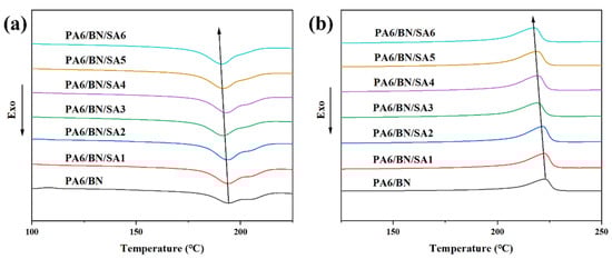 The thermal conducting mechanism of PA6/BN composites is mainly phonon transmission. The transmission efficiency of phonons in the crystalline region is higher than that in the amorphous region. Therefore, the crystallinity of the polymer matrix in the composite has an important impact on phonon transmission. Figure 4 shows the DSC curves of cooling and secondary heating of the composites, and the relevant data are listed in Table 2. With the addition of SA, the melting temperature (Tm) and crystallization temperature (Tc) of PA6 in the composite decrease, which is mainly due to the plasticizing effect of SA in the PA6 matrix. Notably, the crystallinity of PA6 significantly increases with the increase in the SA content, which is consistent with the analysis of the XRD patterns. It is because the addition of SA promotes the exfoliation and dispersion of BN sheets, which increases the number of heterogeneous nucleation points in the composite, thus improving the crystallization of PA6. When the SA content is 5 phr, the crystallinity of PA6 in the composite is the highest, reaching 40.0%, which is 39.9% higher than that of pure PA6. As aforementioned, the dispersion of BN fillers decreases when the SA content is further increased, so the crystallinity of PA6 in the corresponding composite slightly decreases.