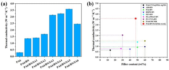 The thermal conductivities of the composites are shown in Figure 5a. When BN is added, the thermal conductivity of the composite is significantly higher than that of pure PA6, 0.3 W m−1 K−1. With the increase in the SA content, the thermal conductivity of the composite increases first and then decreases. The thermal conductivity of the PA6/BN/SA5 composite is the highest, 3.59 W m−1 K−1, which is 12 times and 2.6 times that of pure PA6 and the PA6/BN composite, respectively. It is consistent with the previous analysis. When the content of SA is 3 phr, 4 phr, or 5 phr, SA is mainly dispersed at the interface between BN sheets and the matrix, which improves their compatibility and reduces the scattering of phonons at the interface. Moreover, BN sheets in these composites exhibit excellent orientation, making it easy to construct thermally conductive paths. When the SA content is 5 phr, the crystallinity of the PA6 matrix in the PA6/BN/SA5 composite is the highest, which also contributes to the propagation of phonons in the matrix. Figure 5b exhibits the thermal conductivities of the composites prepared by the melt-blending method reported in the literature [7,37,38,39,40,41,42,43]. The data show that the thermal conductivity of the PA6/BN/SA5 composite is higher than that of other composites, demonstrating that adding a small amount of SA to PA6/BN composites is an effective strategy to fabricate composites with high thermal conductivity.