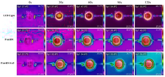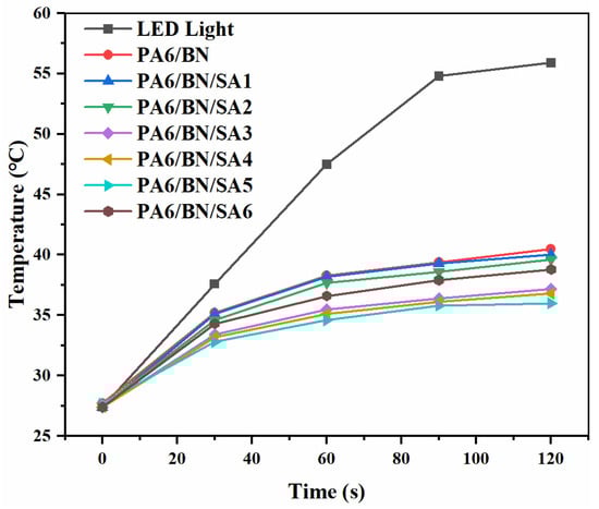 The samples were used as the TIM to detect its heat dissipation effect on the LED lamp and to investigate its thermally conductive property. Figure 6 and Figure 7 show the thermal images and temperature–time profiles of the LED lamps using different composites as TIMs, respectively. After 120 s of power-on, the surface temperatures of the LED lamp with the PA6/BN, PA6/BN/SA1, PA6/BN/SA2, PA6/BN/SA3, PA6/BN/SA4, PA6/BN/SA5, and PA6/BN/SA6 composites as TIMs are 40.5 °C, 40.0 °C, 39.6 °C, 37.2 °C, 36.8 °C, 36.0 °C, and 38.8 °C, respectively, which are much lower than that of the LED lamp without TIM, 55.9 °C. The surface temperature of the LED lamp corresponding to the PA6/BN/SA5 composite is the lowest and quickly reaches the equilibrium point after 30 s.
