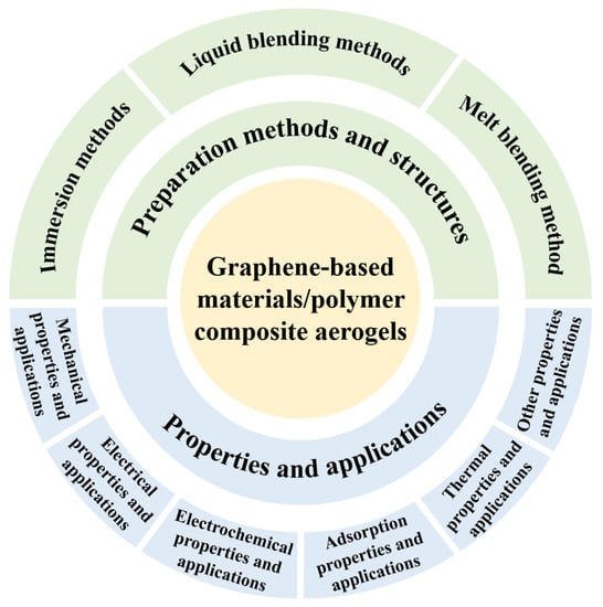 In recent years, graphene-based materials/polymer composite aerogels have been extensively studied. As shown in Figure 1, this paper summarizes the preparation methods, structures, interactions, properties, applications of graphene-based materials/polymer composite aerogels. First, the preparation methods are discussed and divided into three categories, including impregnation methods, liquid blending methods, and melt blending methods. Second, the structures and interactions of graphene-based materials/polymer composite aerogels are discussed. Finally, the mechanical properties, electrical properties, thermal properties, adsorption properties, other properties, and the respective applications of graphene-based materials/polymer composite aerogels were discussed. This paper will both help readers quickly gain familiarity with this field and provide them with more guidance about the rational design and preparation of advanced aerogel materials.