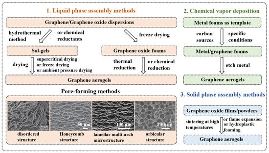 In order to better understand the composition of graphene-based materials/polymer composite aerogels, Figure 2 and Figure 3 summarize the preparation methods of graphene aerogels and polymer foams, respectively. The preparation methods of graphene aerogels are mainly divided into three categories, including liquid phase assembly [7], chemical vapor deposition (CVD) [6], and solid phase assembly [27]. The liquid phase assembly method is mainly divided into two categories according to the preparation process. The first method is as follows. GO solution formed a wet gel (sol-gel) using the hydrothermal [7] or chemical method [28,29,30]. Then, graphene aerogels were obtained by drying through various techniques. In the second method, GO solutions were directly freeze-dried [13], then graphene aerogels were obtained using chemical vapor reduction or thermal reduction [31,32]. The liquid phase assembly method involves pore formation and drying. Ice templates [12,33,34,35,36,37], bubble templates [11,38,39,40], or emulsion templates [22,41,42] are commonly used to regulate the pore structures. The SEM images of graphene aerogels with different pore structures are shown in Figure 2. At present, the drying methods include supercritical drying [8,43,44,45,46], freeze drying [47,48,49,50,51], and ambient pressure drying [10,14,15,52,53]. The CVD template method involves depositing graphene on the metal foam substrates through chemical vapor deposition, then etching the metal foam substrates [54,55,56]. Finally, solid phase assembly methods mainly use GO films (for flame expansion or plastic foaming) or powders (for high temperature welding) as precursors to prepare graphene aerogels. [57,58].
