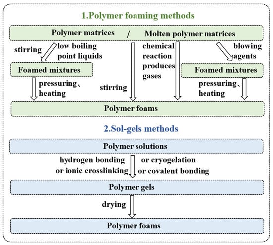 Polymer foams are mainly prepared using polymer foaming or gel-drying methods. Polymer foaming methods are divided into three types according to the foaming method: physical, mechanical, and chemical. In physical foaming, low-boiling-point (BP) liquid and polymer are blended and then foamed through pressuring and heating [59]. In addition, air is added in polymer resin by mechanical stirring; then, the resin is foamed. Finally, the chemical foaming process can be undertaken using the following methods. In the first method, chemical reactions between the two polymers occur to produce inert gases, and then, the polymers are foamed. In the second method, a foaming agent is added to molten polymer, and a gas is released. Then, the polymer is foamed by pressure and heating [60]. Physical foaming is the most widely used method. Because the foaming agent used in the physical foaming method is generally inert compressed gas, it only changes in the physical form during the foaming process, making the physical foaming method greener and more environmentally friendly. There is no chemical residue in the prepared polymer foam material, which can meet people’s increasing requirements for polymer foam materials.