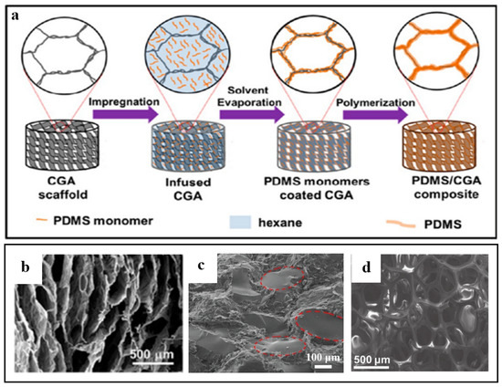 As shown in Figure 4a, Hu et al. [61] first prepared compressible graphene aerogel (CGA) with porous structure. Subsequently, it was immersed in a hexane solution containing poly(dimethylsiloxane) (PDMS) monomer and curing agent, and then placed in a vacuum furnace and heated to remove the solvent. Further heating-induced PDMS was polymerized on the cell walls of graphene aerogel, and finally, graphene/PDMS composite aerogel was obtained. The graphene/PDMS composite aerogel exhibited a 3D interconnected structure, indicating that PDMS was mainly distributed on the surface of the cell wall instead of in the filling hole (Figure 4b). Liang et al. [62] combined 3D graphene nanoplatelets (GNPS)/RGO foam with epoxy using the impregnation method and prepared the composite material. Figure 4c shows that the cured epoxy resin was evenly distributed in the micropore space. The size of the spherical block is between 50~150 μm, which is consistent with the pore size of the GNPS/RGO foam skeleton; this demonstrates that the structure of the GNPS/RGO foam skeleton is inherited after filling the epoxy resin. In addition, Chen et al. [63] grew graphene on nickel foam by CVD at 1000 °C and atmospheric pressure, which was similar to the structure of nickel foam. Then, a thin layer of PDMS was impregnated on the surface of the graphene, and the graphene/PDMS composite foam was obtained by etching the nickel foam substrate with HCl. As shown in Figure 4d, the composite has high porosity and inherits the 3D network structure of nickel foam well.
