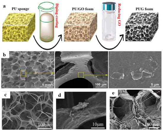 (a) Fabrication process of the PUG foam. (b) The SEM images of the PUG foam. Reproduced with permission from [64]. (c,d) The SEM images of ODA-RGO@MF foam. Reproduced with permission from [65]. (e) The microstructure of PFGA. Reproduced with permission from [66].