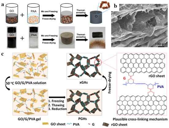 In this method, after mixing, reducing, and drying, the polymers and graphene-based materials solutions immediately form graphene-based materials/polymer composite aerogels [67,68,69,70]. As shown in Figure 6a, Qin et al. [71] prepared reduced GO/polyimide (RGO/PI) composite aerogels with ultra-high elasticity using a two-step method. Firstly, the polyimide precursor, polyamic acid (PAA), and GO dispersions were directly mixed. During the compositing process, PAA was anchored on the GO sheets using hydrogen bonding, which could limit the agglomeration effect of GO in the self-assembly process. After freeze-drying and heat treatment, the PAA was dehydrated to form polyimide, while GO was reduced and self-assembled into a highly porous structure, and then formed the RGO/PI composite aerogel. The remarkable layered skeleton of the RGO/PI composite aerogel helps to effectively transfer loads between RGO sheets and PI components under mechanical deformation, thereby improving mechanical properties (Figure 6b). Furthermore, polymers with active functional groups on the surface can also be crosslinked with GO by covalent bond or noncovalent bond, and then form composite aerogels [72,73]. Ye et al. [74] reported a series of lightweight and shape-recoverable graphene aerogels by cross-linking GO and polyvinyl alcohol (PVA) with an effective cross-linker glutaraldehyde (G) (Figure 6c). Aldehyde groups from G molecules reacted with hydroxyl groups of GO sheets and PVA chains by intermolecular acetalization. Therefore, PVA chains not only attached onto graphene surfaces through hydrogen bonds but also connected the neighboring graphene sheets by covalent cross-linking. Cross-linking interaction is beneficial to the structural stability of the composite aerogels.