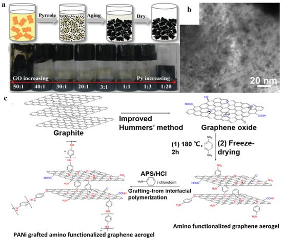 In this method, polymer monomers and graphene or GO are polymerized to obtain graphene-based materials/polymer composite aerogels [75,76,77]. For example, Sun et al. [78] mixed GO dispersions and monomer pyrrole (Py) ultrasonically; the mixtures were aged at room temperature and formed hydrogels. During the aging process, pyrrole could reduce GO; it was oxidized and polymerized to form polypyrrole (PPy). Finally, graphene/PPy composite aerogel was obtained by freeze-drying (Figure 7a). As shown in Figure 7b, PPy in the form of plate-like nanoparticles with different sizes disorderedly anchors onto RGO nanosheets, which could be attributed to the polymerization of Py with different oxygen-containing groups that have different oxidizing abilities randomly attached on GO nanosheets. In addition, as shown in Figure 7c, Mahdavi et al. [79] prepared amino-functionalized graphene aerogel grafted with polyaniline nanofibers. Polyaniline nanofibers presented a small spherical structure on the surface of smooth aminated graphene aerogel. The formation of spheres may be due to both short PANI chains anchored on the amino groups that are on the surface of graphene aerogels and to heterogeneous nucleation.