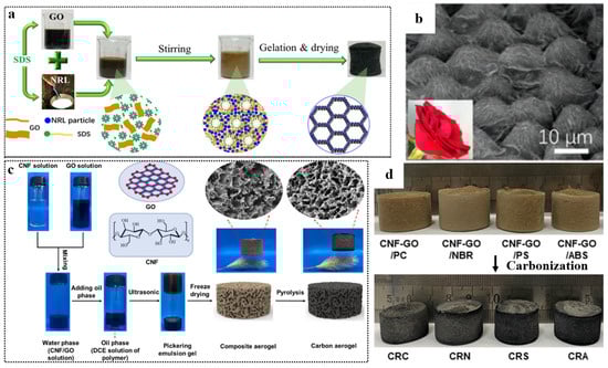 For traditional rubber latex, graphene-based materials/polymer composite aerogels can be obtained by direct emulsion blending with GNS or GO. For example, Zhang et al. [23] prepared a tough, ultralight (4.6 mg cm−3), highly compressible (>90%), and water-adhesive graphene/NRL hybrid aerogel (Figure 8a). As shown in Figure 8b, the NRL particles are wrapped by graphene layers to form sandwich-like cell walls with a rose-petal-like surface. In order to prepare graphene-based materials/polymer composite aerogels, some water-insoluble polymers can be dissolved in oily solvents and blended with graphene or GO in an emulsion. Liao et al. [80] mixed GO with cellulose nanofiber (CNF) to obtain a uniform aqueous phase dispersion, and then dissolved a series of polymers such as polycarbonate (PC), nitrile rubber (NBR), polystyrene (PS), and acrylonitrile butadiene styrene (ABS) into 1, 2 dichloroethane (DCE) to obtain an oil phase polymer DCE solution. The aqueous phase was then mixed with the oil phase to form an O/W Pickering emulsion gel. The gel was freeze-dried and carbonized, and graphene-based materials/polymer composite aerogel was formed (Figure 8c). The pictures of different polymer/graphene-based materials composite aerogels are shown in Figure 8d. However, the preparation of this composite aerogel is harmful to environment because of the use of oil solvents.